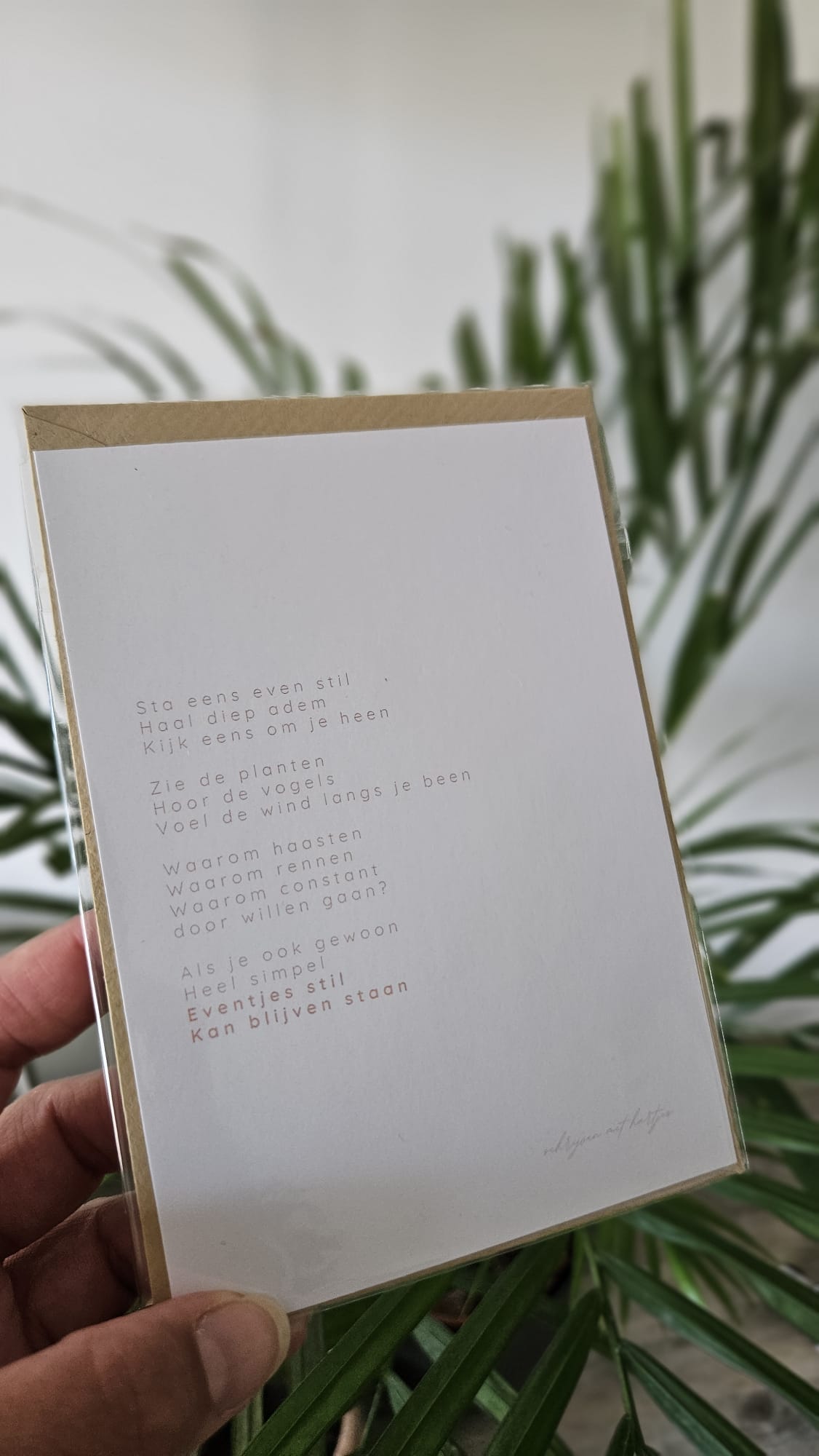 A6 kaart inclusief kraft envelop, met mijn gedicht ‘Sta eens even stil’.